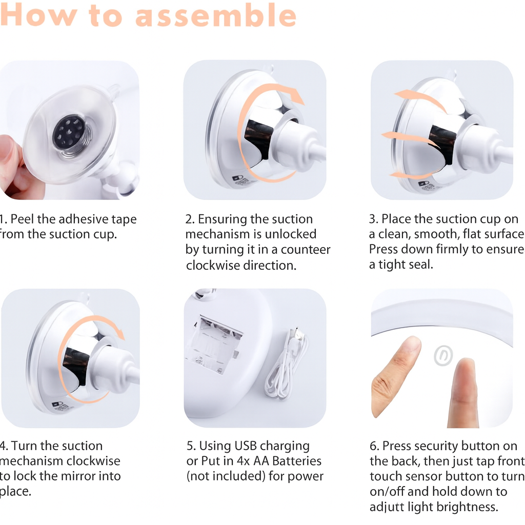 【Simple Operation】Comes with a free small 3x magnifying mirror—perfect for precise makeup like eyeshadow, eyeliner, and mascara. The travel makeup mirror can stands on its own, with highly sensitive, long-lasting touch buttons. Short press to turn on, long press to adjust brightness.